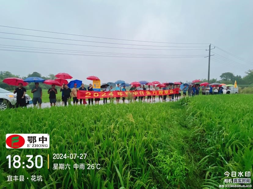 7月27日,江西分公司攜手宜豐縣西門農(nóng)資,在芳溪鎮(zhèn)花坑村舉辦了一場(chǎng)鄂中仟金方水稻示范觀摩會(huì),來自當(dāng)?shù)匾约案甙彩?、上高縣的150余名種植戶參加了觀摩活動(dòng)。