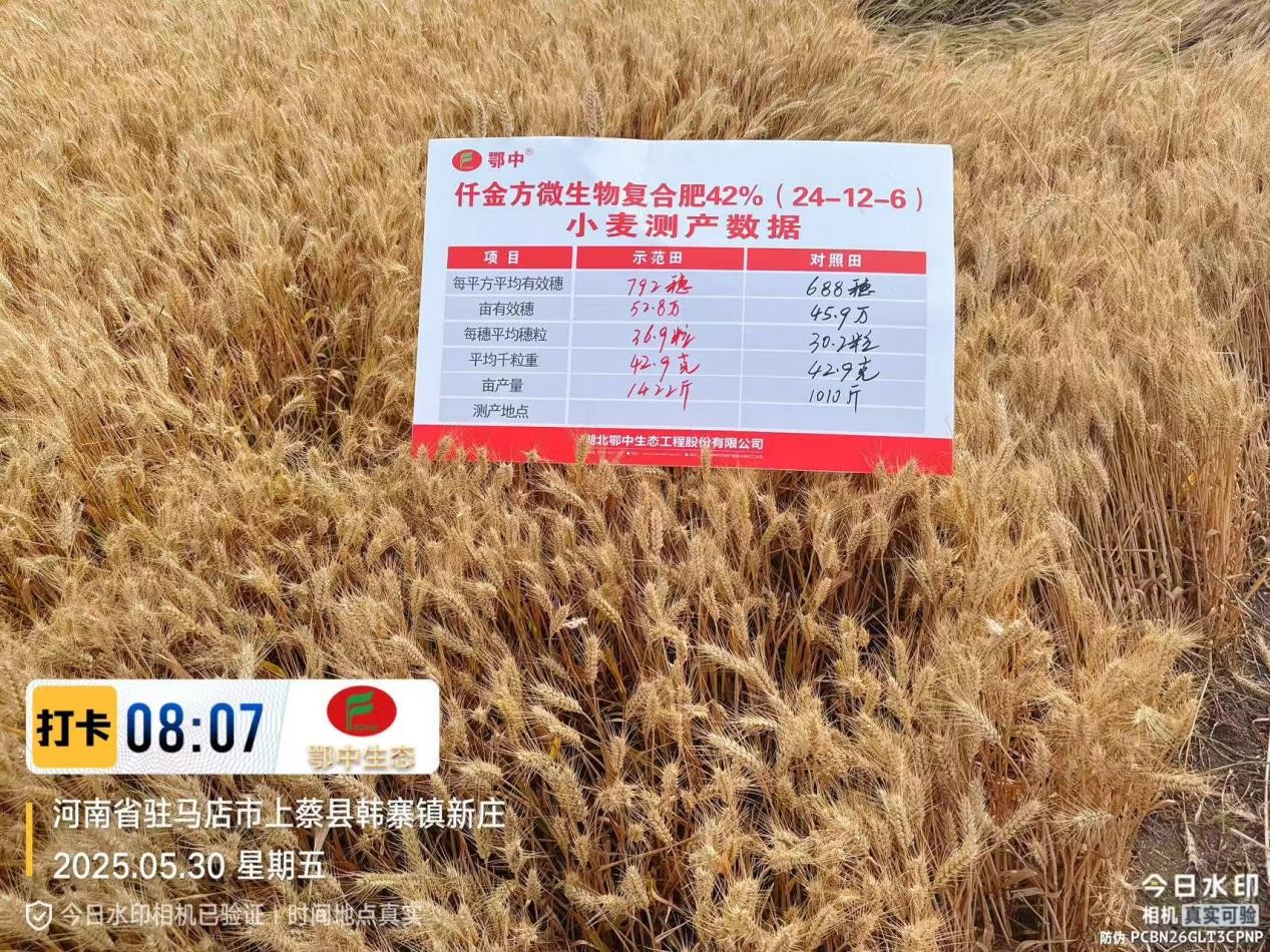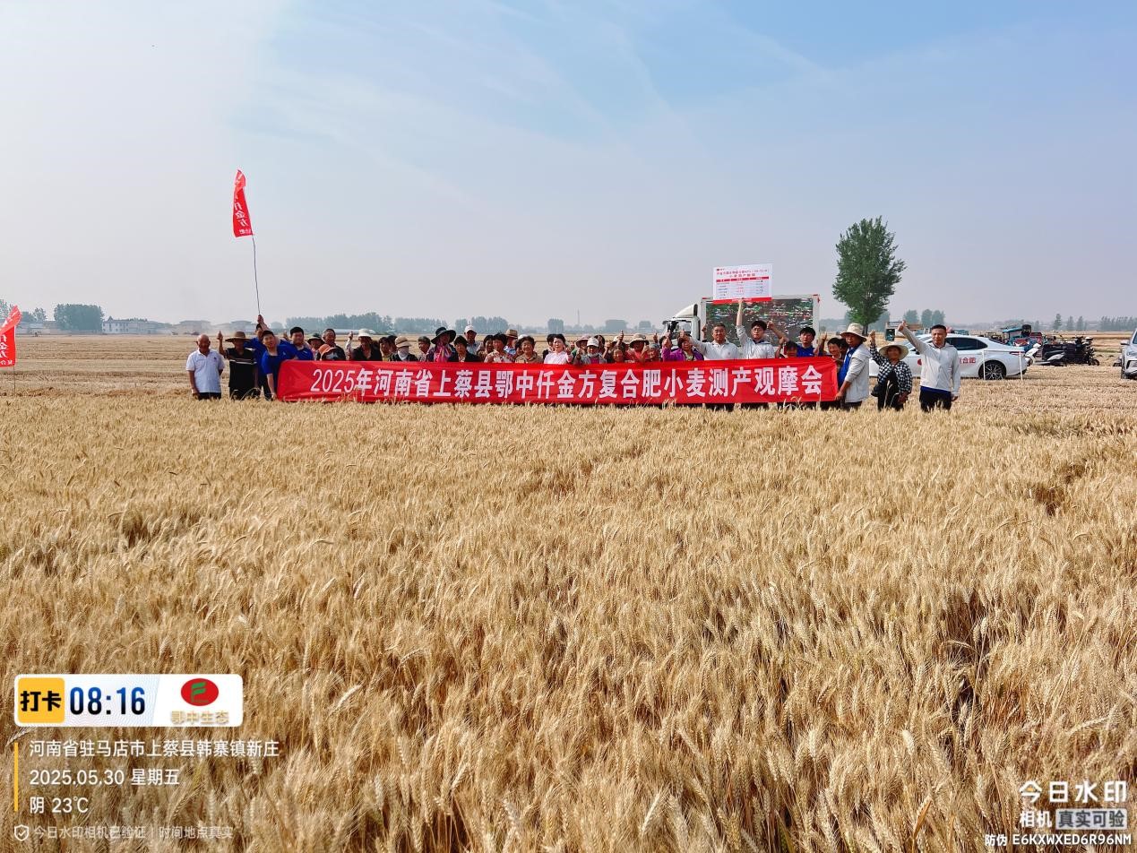 另一場(chǎng)測(cè)產(chǎn)會(huì)在上蔡韓寨鎮(zhèn)舉行,重點(diǎn)關(guān)注小麥種植。該鎮(zhèn)從去年上半年開(kāi)始推廣仟金方花生肥,并在花生收獲期得到了用戶的肯定。去年下半年小麥種植季節(jié),盡管小麥經(jīng)濟(jì)價(jià)值不高,部分農(nóng)戶仍然選擇繼續(xù)使用仟金方肥料。在整個(gè)小麥生育期,使用過(guò)仟金方產(chǎn)品的小麥與周邊地塊的長(zhǎng)勢(shì)形成了鮮明對(duì)比。在近期小麥?zhǔn)斋@期,公司配合當(dāng)?shù)剞r(nóng)技部門(mén)組織了現(xiàn)場(chǎng)測(cè)產(chǎn),結(jié)果顯示,使用過(guò)仟金方的地塊與對(duì)照田相比,畝產(chǎn)量增產(chǎn)400余斤。