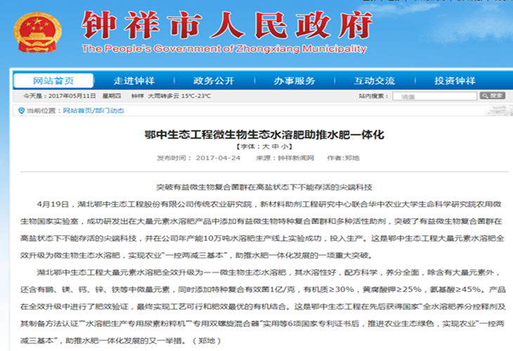 《北方農(nóng)資》.《荊門晚報(bào)》.《鐘祥市政府網(wǎng)站》.《鐘祥新聞網(wǎng)》:鄂中生態(tài)工程微生物生態(tài)水溶肥助推水肥一體化