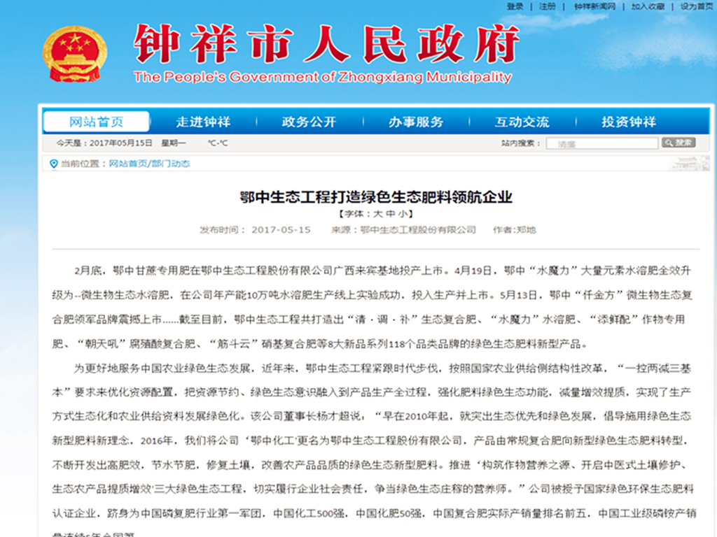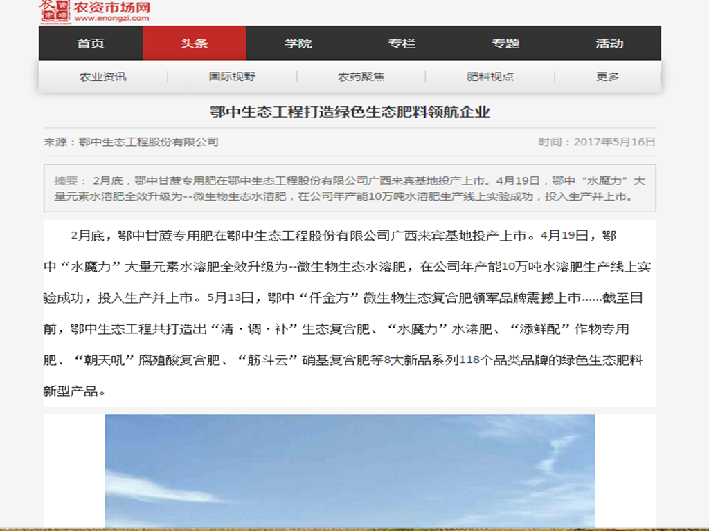 《農(nóng)資與市場》.《中國新型肥料網(wǎng)》.《鐘祥市政府網(wǎng)站》.《北方農(nóng)資》:鄂中生態(tài)工程打造綠色生態(tài)肥料領航企業(yè)