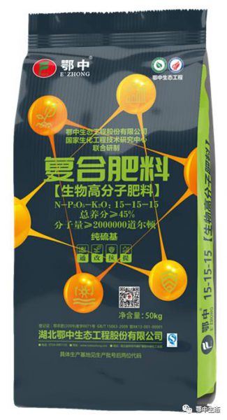 生物高分子復(fù)合肥料是由鄂中生態(tài)工程股份有限公司與國家生化工程技術(shù)研究中心聯(lián)合研發(fā),在常規(guī)復(fù)合肥中對肥料進(jìn)行改性,根據(jù)不同肥料加工工藝和不同作物需肥要求,定制化添加不同劑型及不同分子量的生物高分子肥料助劑而形成的新型功能型增效復(fù)合肥產(chǎn)品。是中國首款生物高分子復(fù)合肥料,農(nóng)民用得起的新型環(huán)保生態(tài)增效肥料。