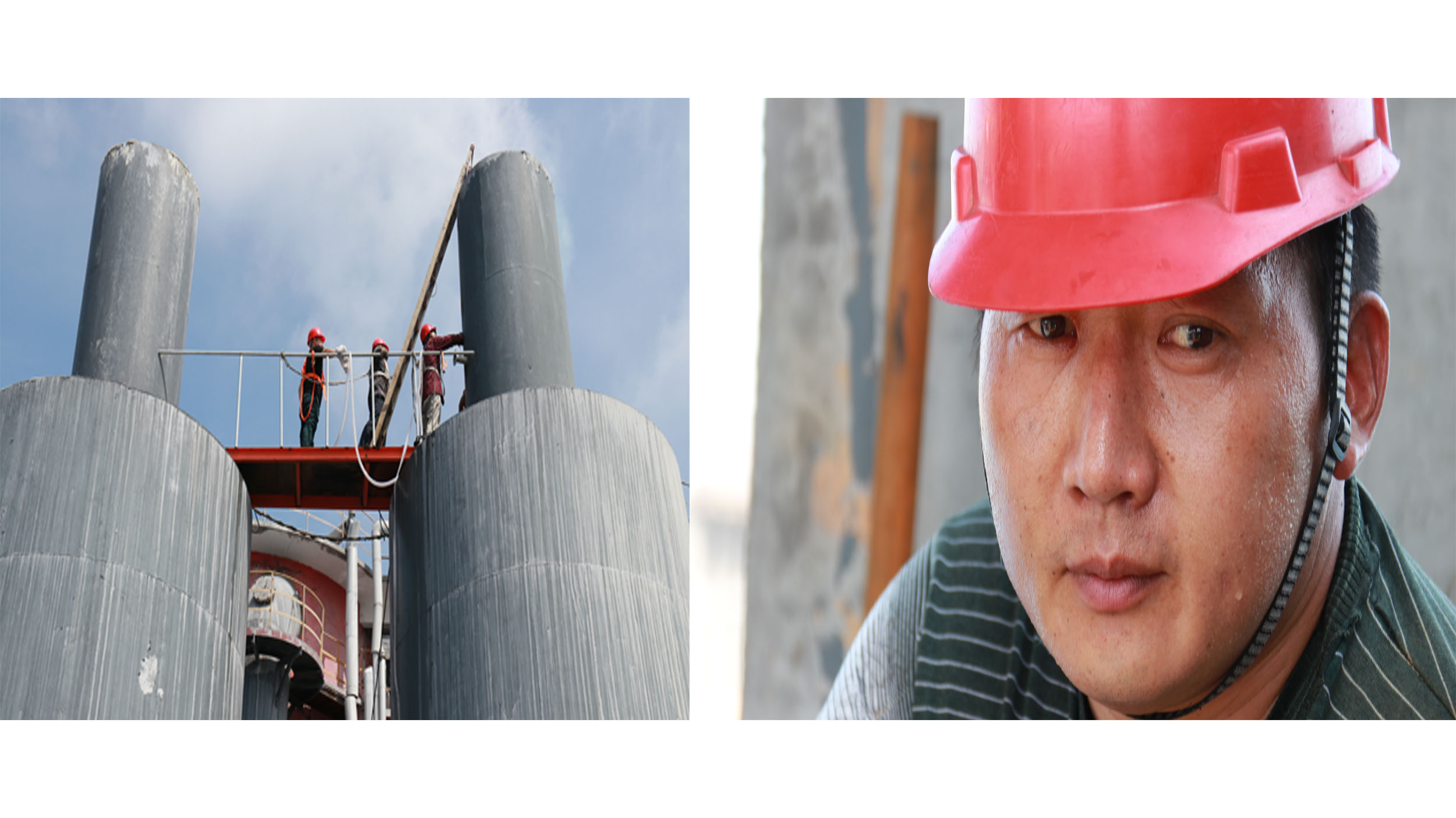 當日,總部硫酸廠二線一維修工在脫硫塔上檢修,揮汗如雨。