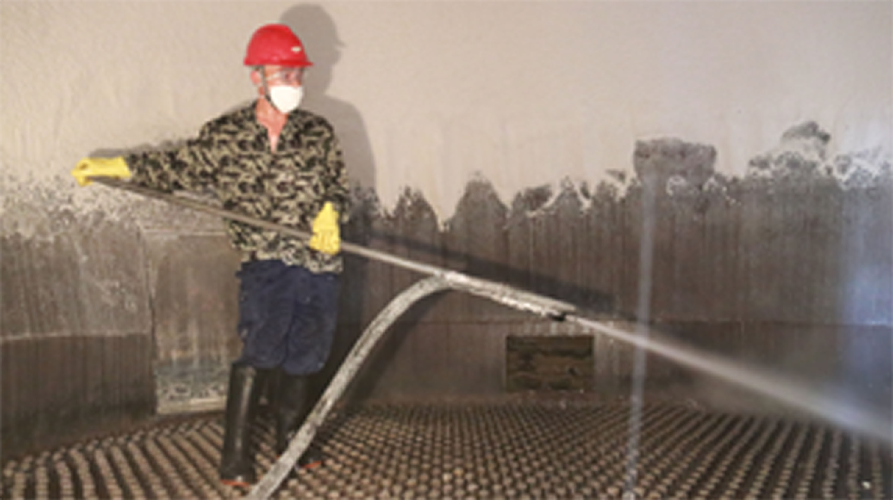 總部磷銨廠噴粉塔內(nèi)溫度高達80多攝氏度,塔內(nèi)異常悶熱。為保證正常生產(chǎn),該廠每2-3天都會用80多度的高溫熱水對塔壁、床層進行清洗。圖為該廠一生產(chǎn)班班長在塔內(nèi)清洗作業(yè)。