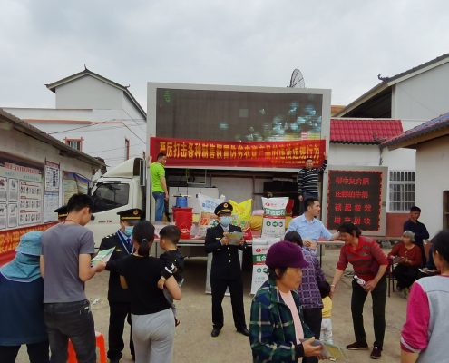 (圖為來賓市農(nóng)業(yè)農(nóng)村局工作人員及鄂中農(nóng)化師為農(nóng)戶講解如何辨別肥料真假)